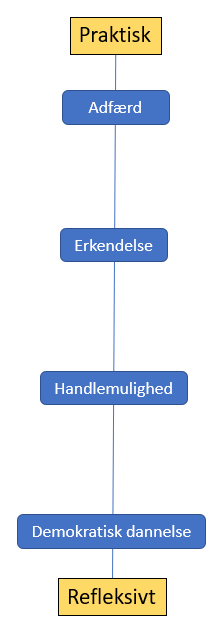 Ofte vil adfærd handle om vores praktiske udøvelse af digital dannelse, fx brug af teknologier. Og ofte vil vores demokratiske dannelse handle om vores refleksive udøvelse, fx ved etiske overvejelser over brugen af apps og deres tilladelser.