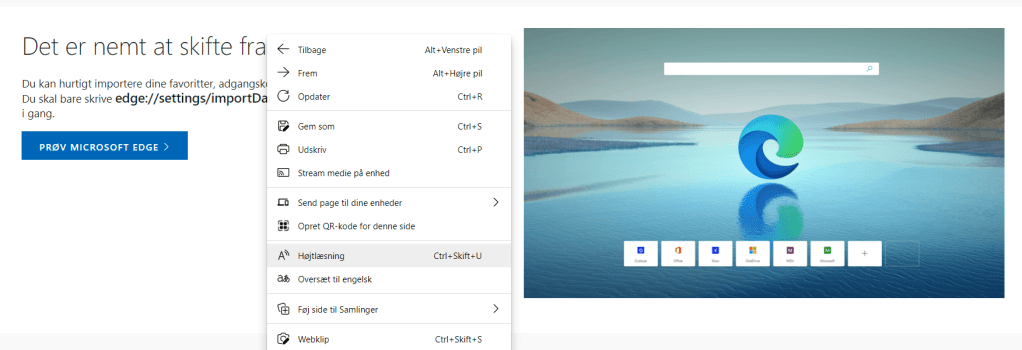 Brug browseren Edge til at få læst tekster højt. Du kan vælge mellem forskellige stemmer, sprog, køn, hastighed, naturlighed. Tryk Control+Skift+U eller højreklik og vælg Højtlæsning.